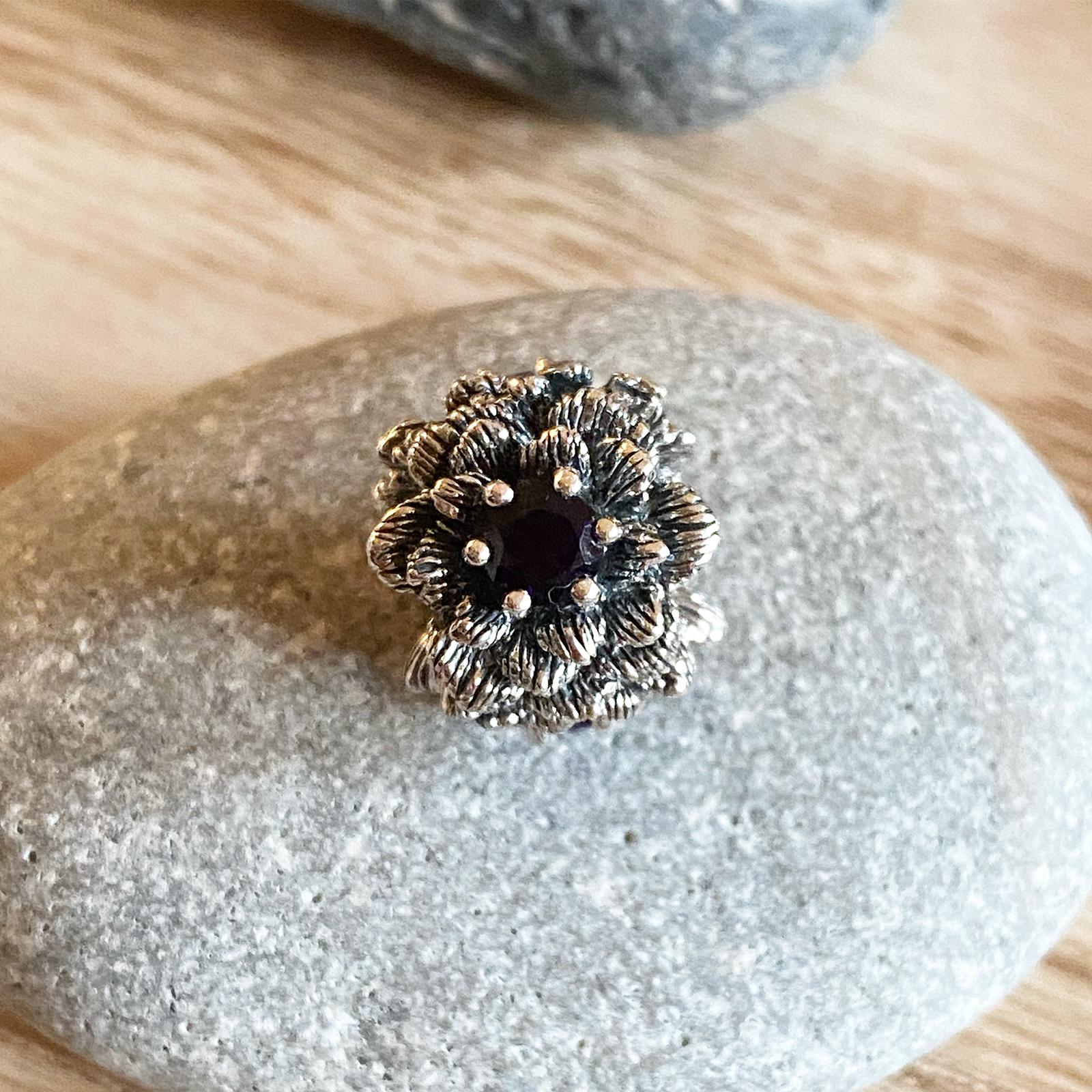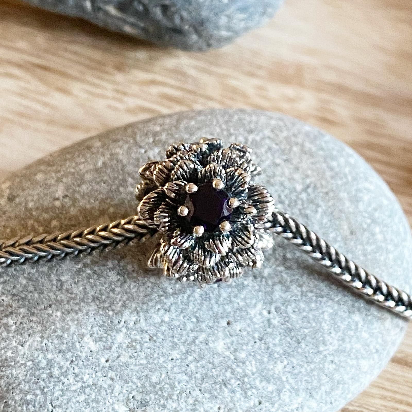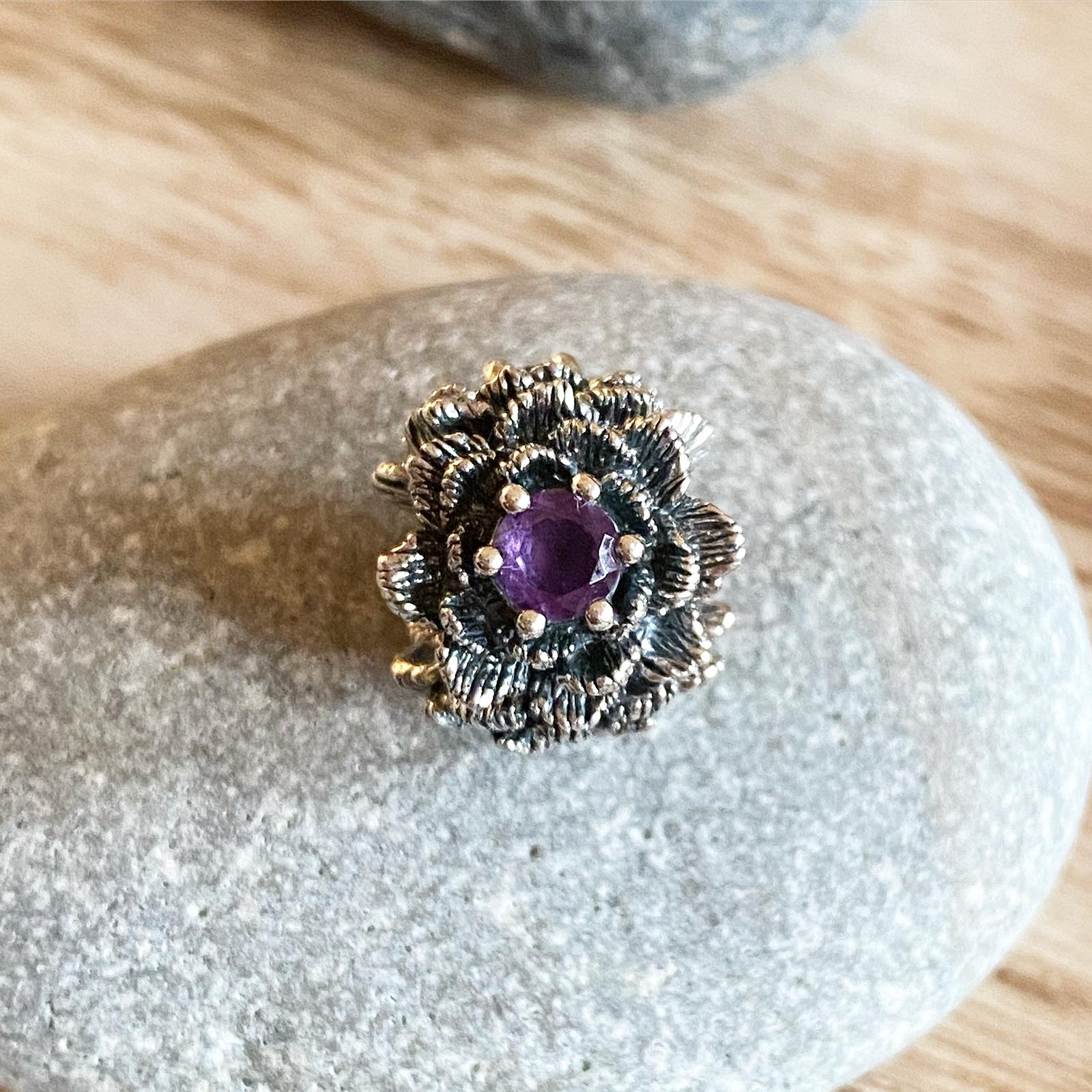 There is a purple amethyst in the middle of each flower. Each bead consists of three flowers.