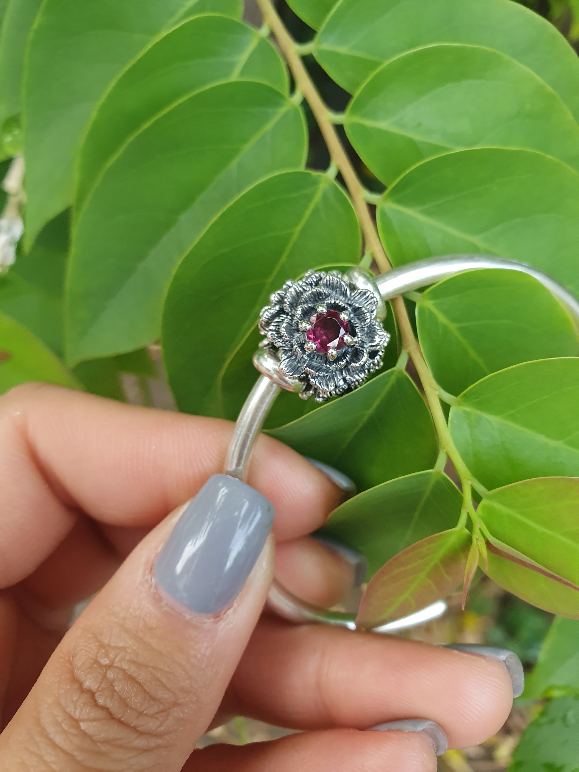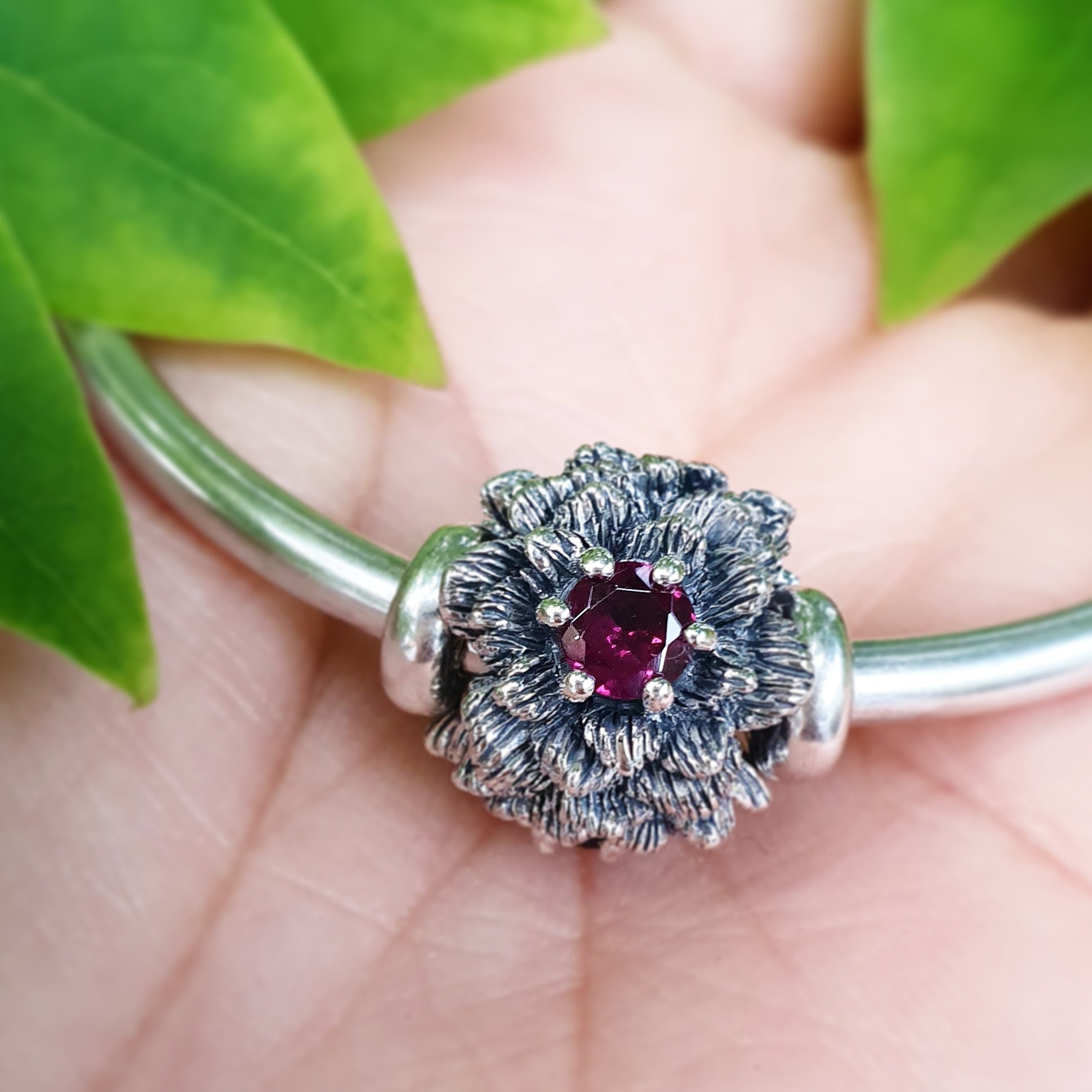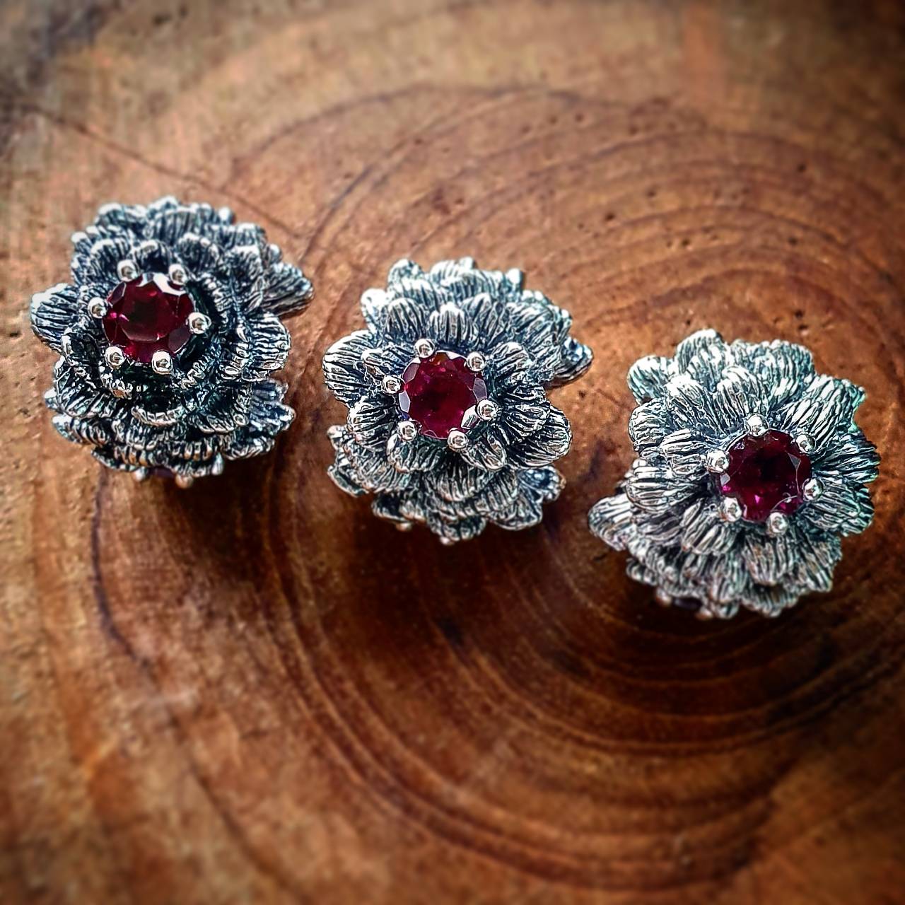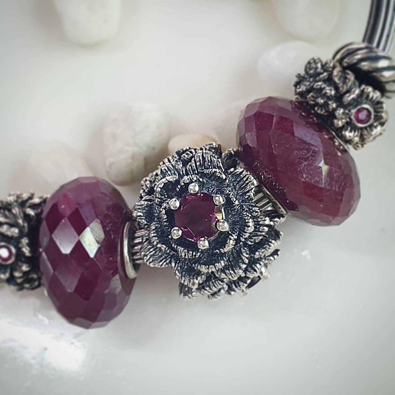 In the middle of each flower there is a red rhodolith (a kind of grenade). Each bead consists of three flowers.