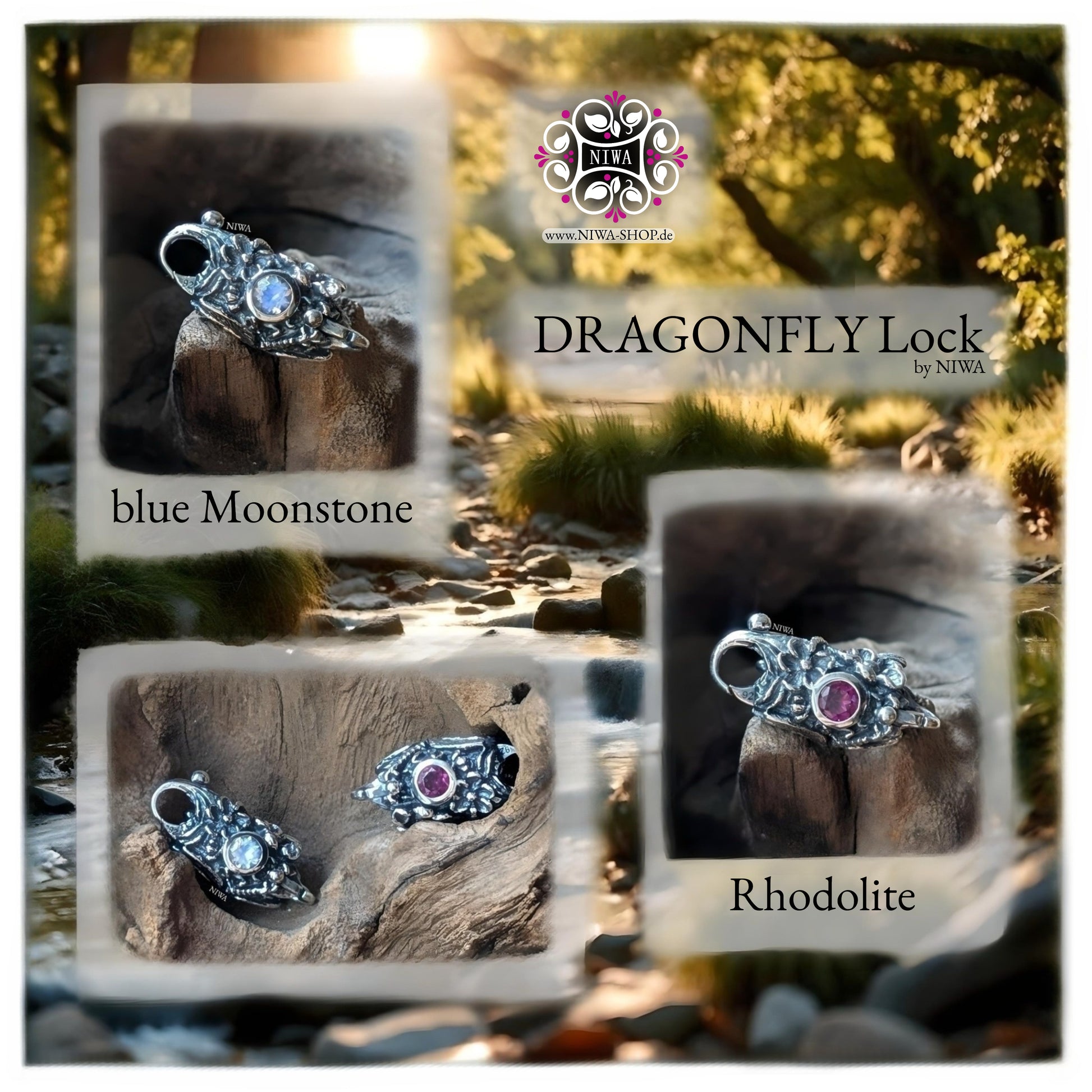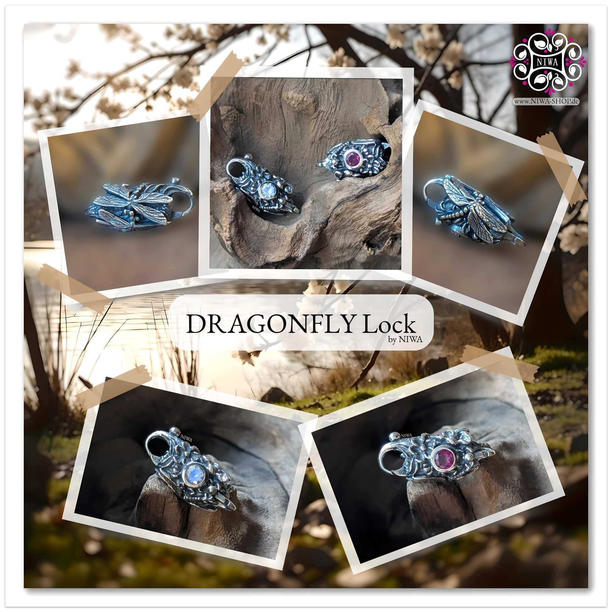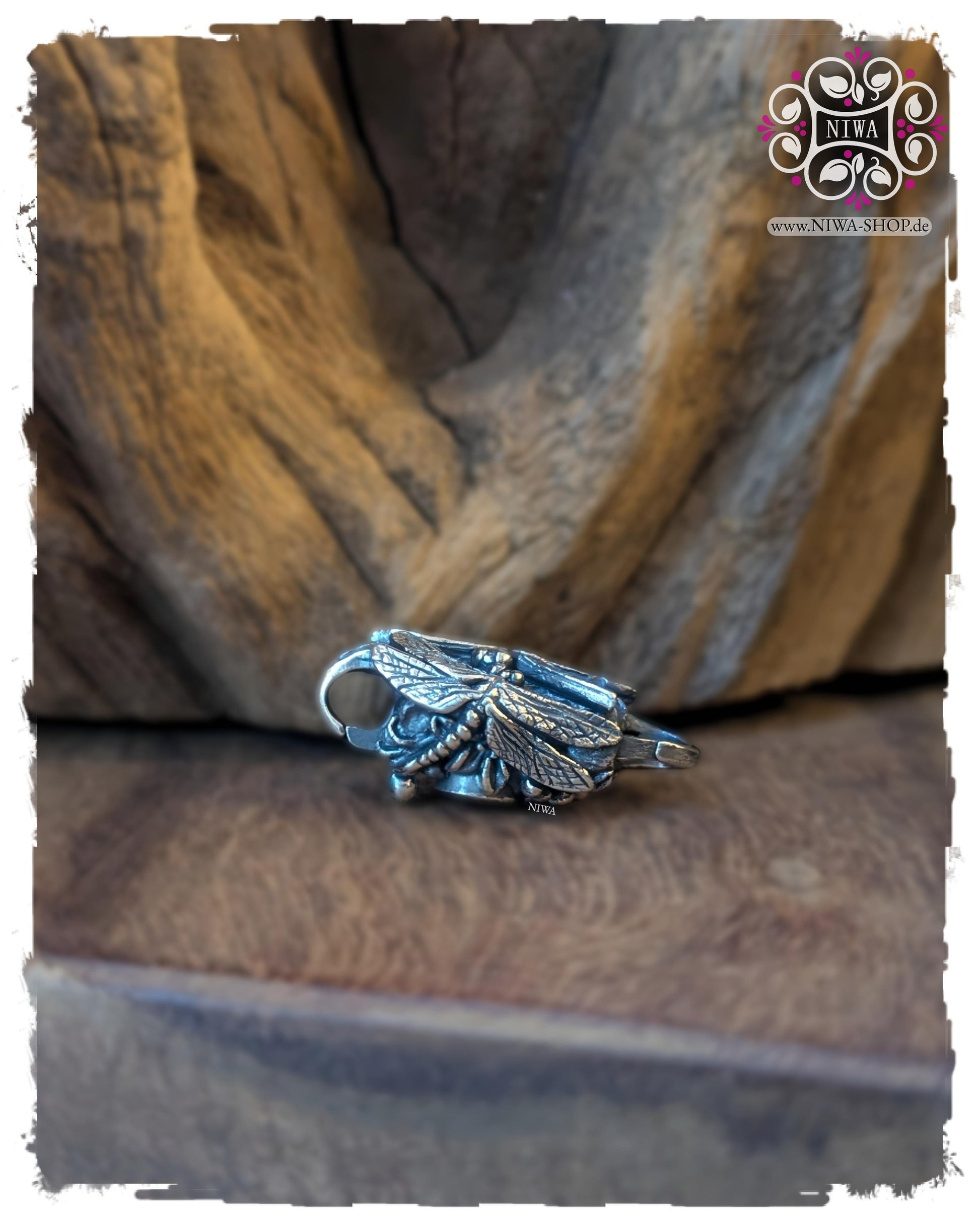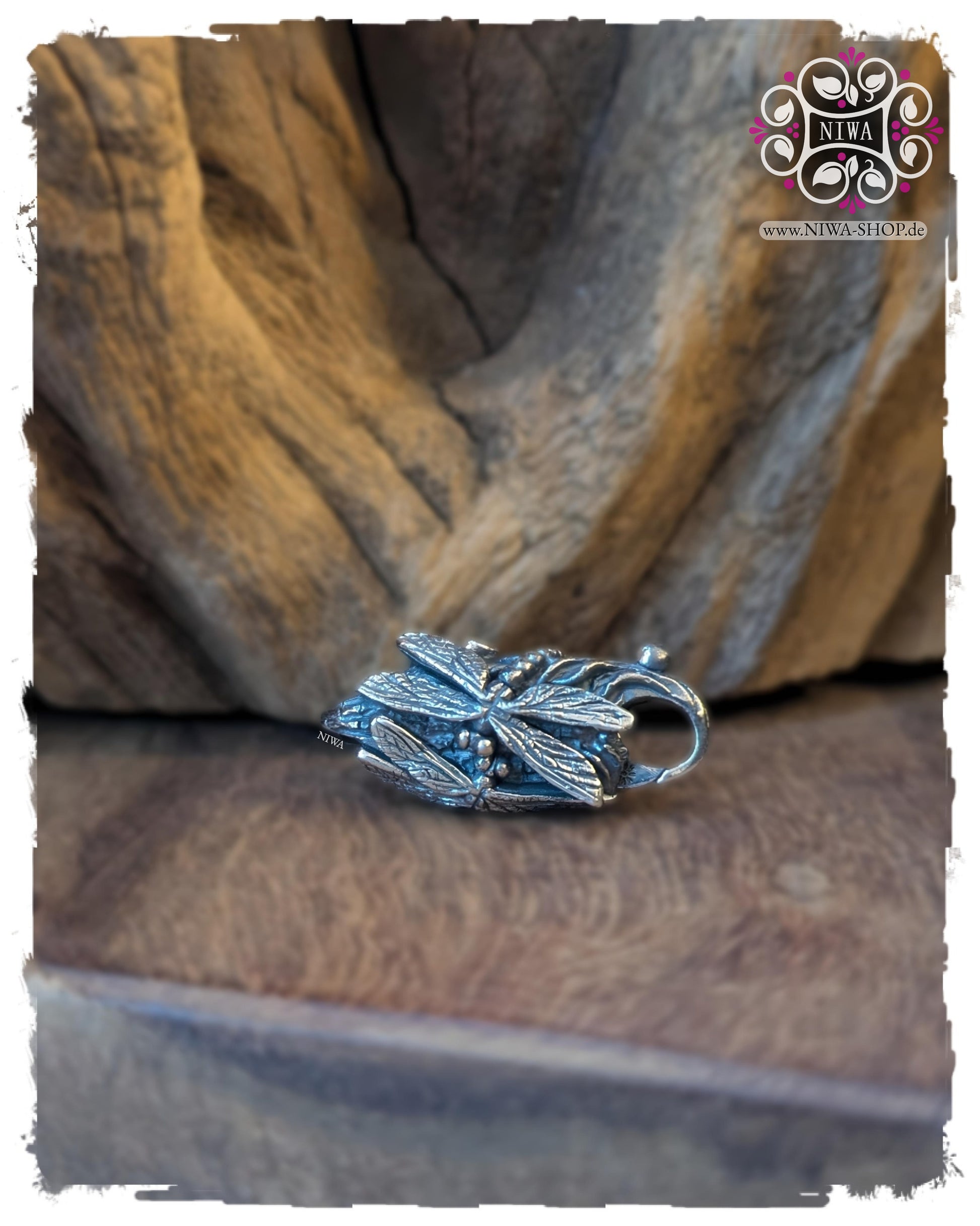 This artistically designed closure made of massive 925 sterling silver combines elegance and symbolism in a masterful design. Two graceful dragonflies adorn the lock and were worked with filigree precision to capture the lightness and magic of these fascinating creatures.