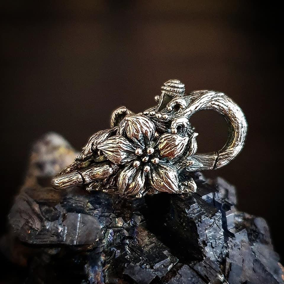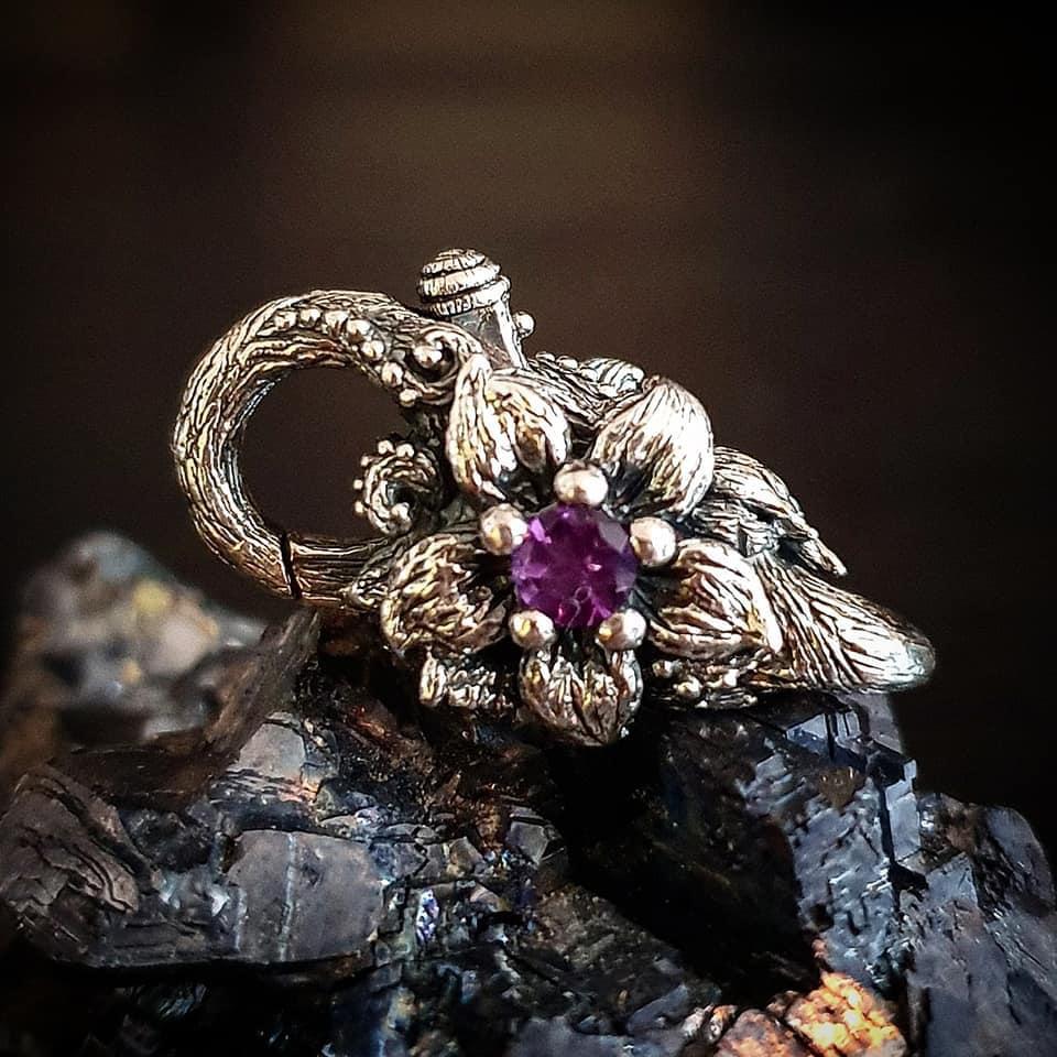 In the middle of the silver flower, the beautiful purple tanzanite is hidden.