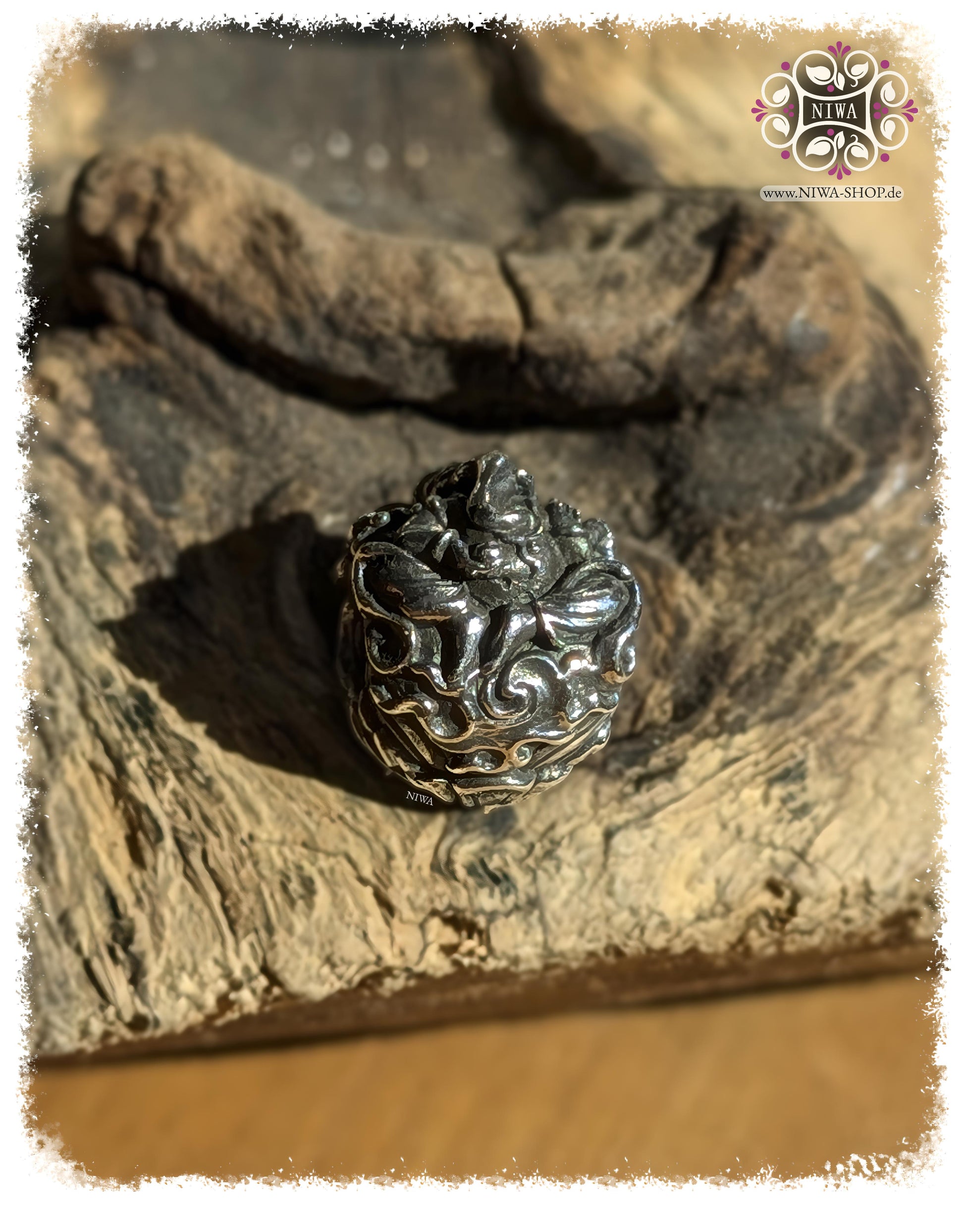 The spherical Ganesha sits in a gracefully curved lotus pose, as if fully centered within himself. Gentle waves and entwined ornaments flow around his body like a mantra, rhythmic, protective, and focused. On his forehead he carries a fine diamond, symbolizing the third eye, a light of insight.