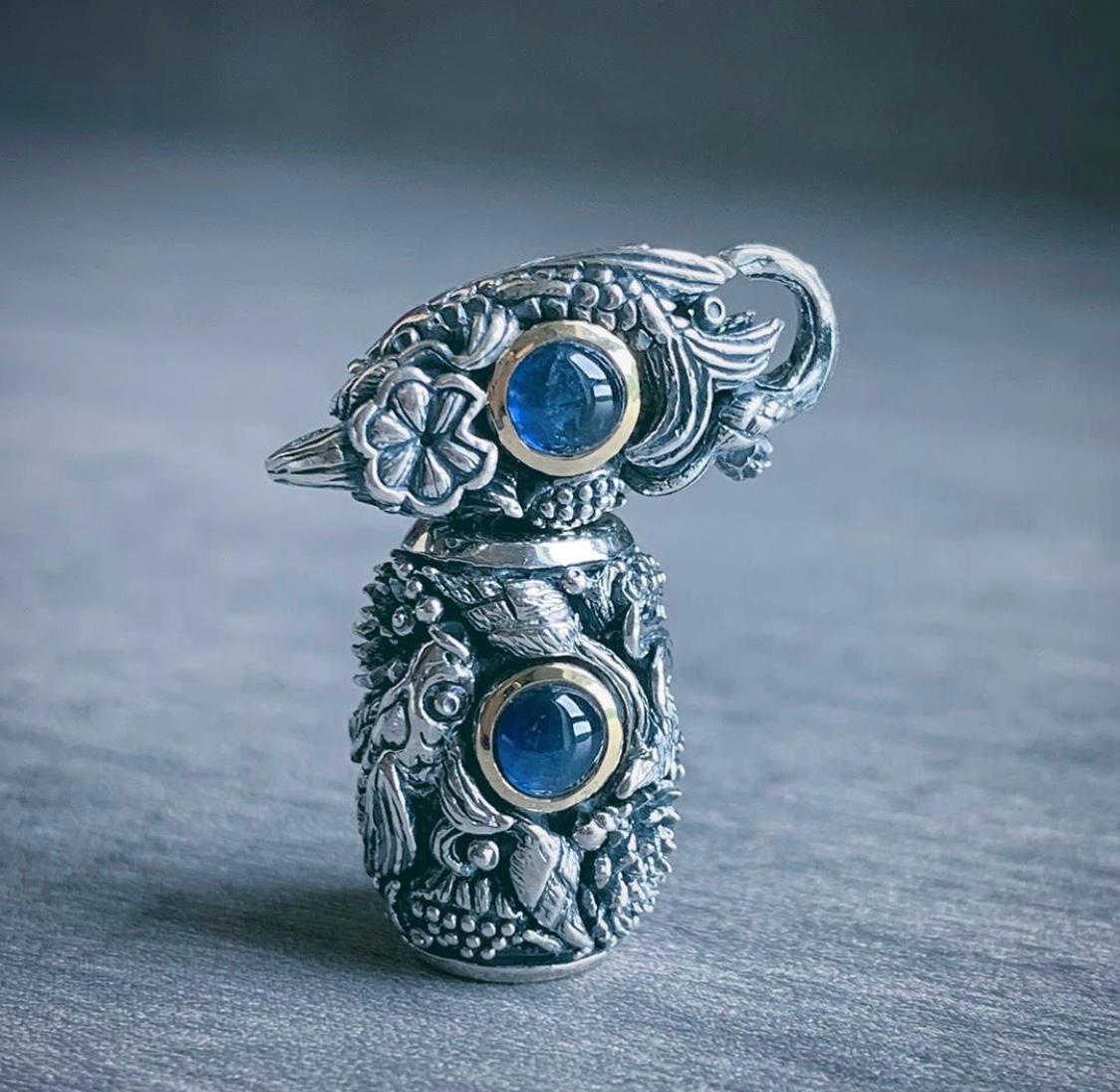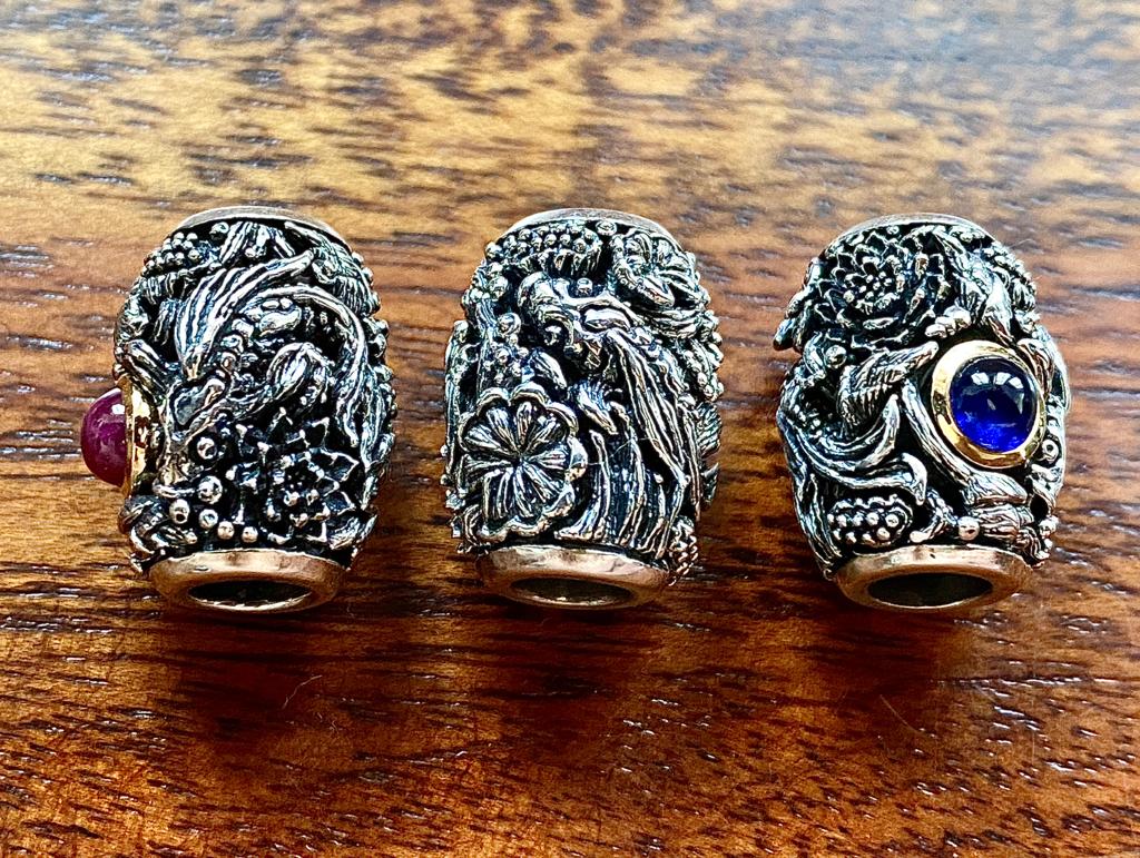 This closure consists of 925 silver, 18k gold and one of three gemstones: sapphire (blue), jade (green) or ruby (pink).
