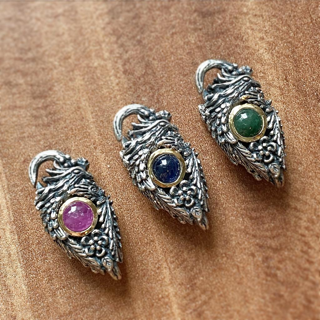 This lock consists of 925 silver, 18k gold and one of three gemstones: sapphire (blue), jade (green) or ruby (pink).