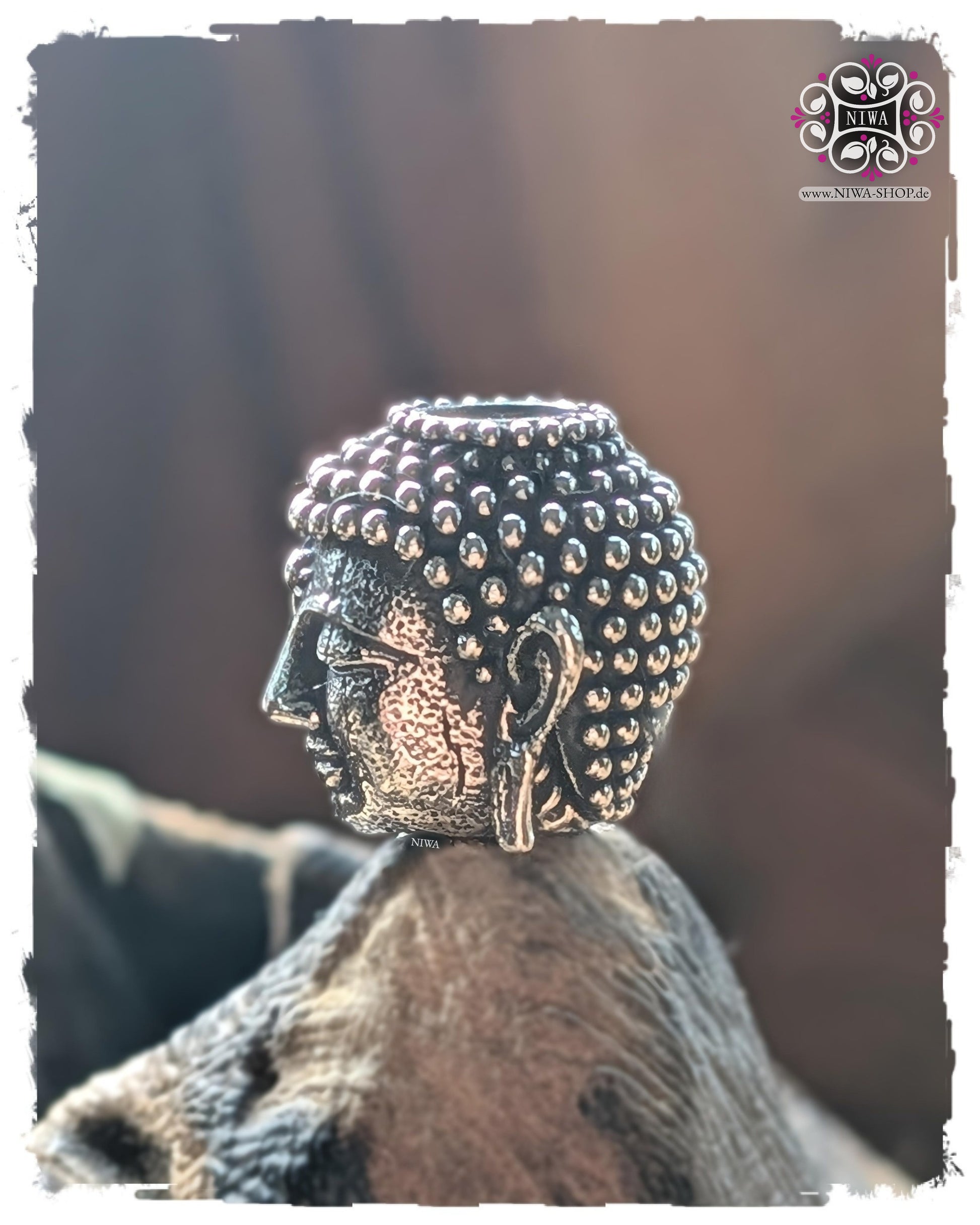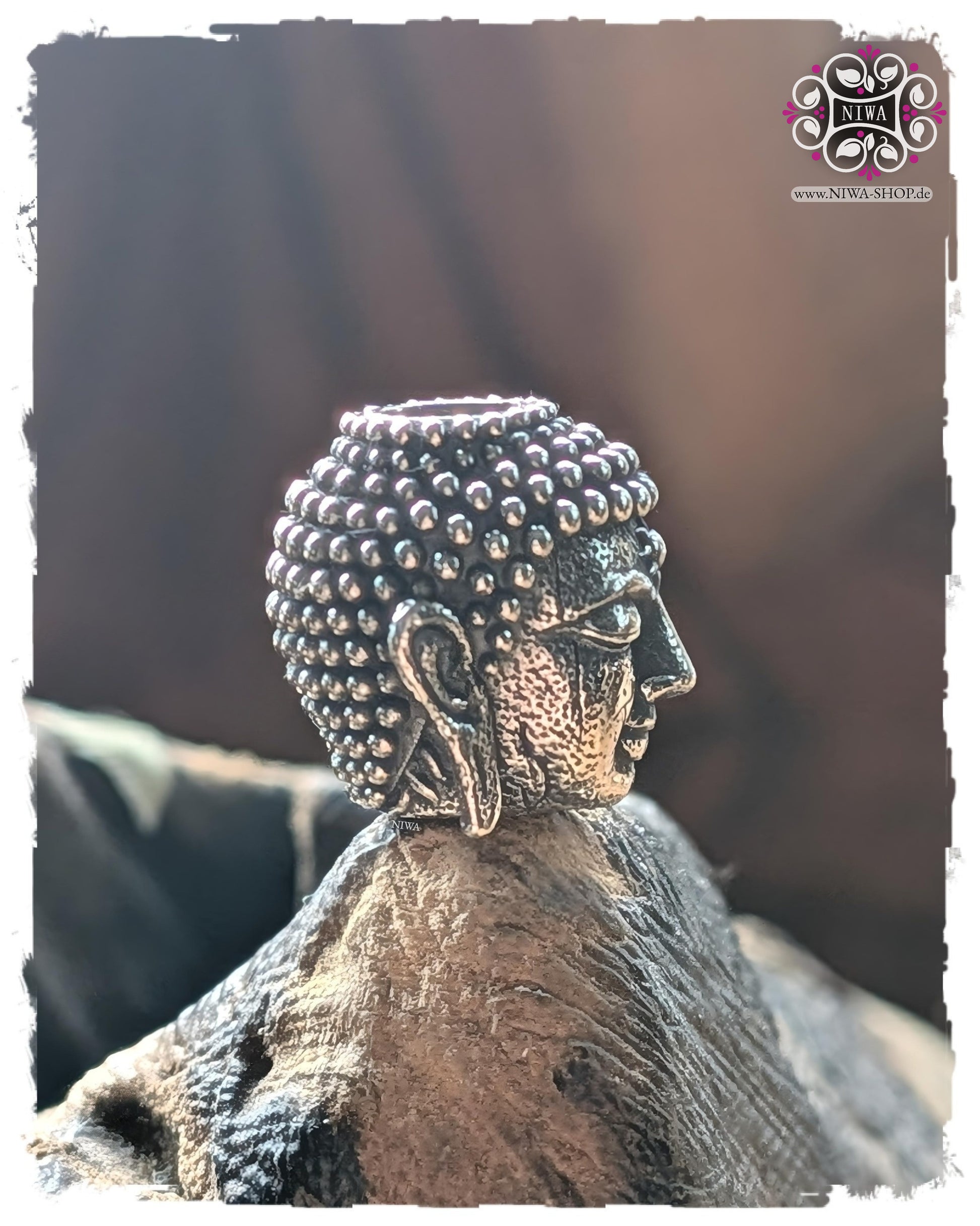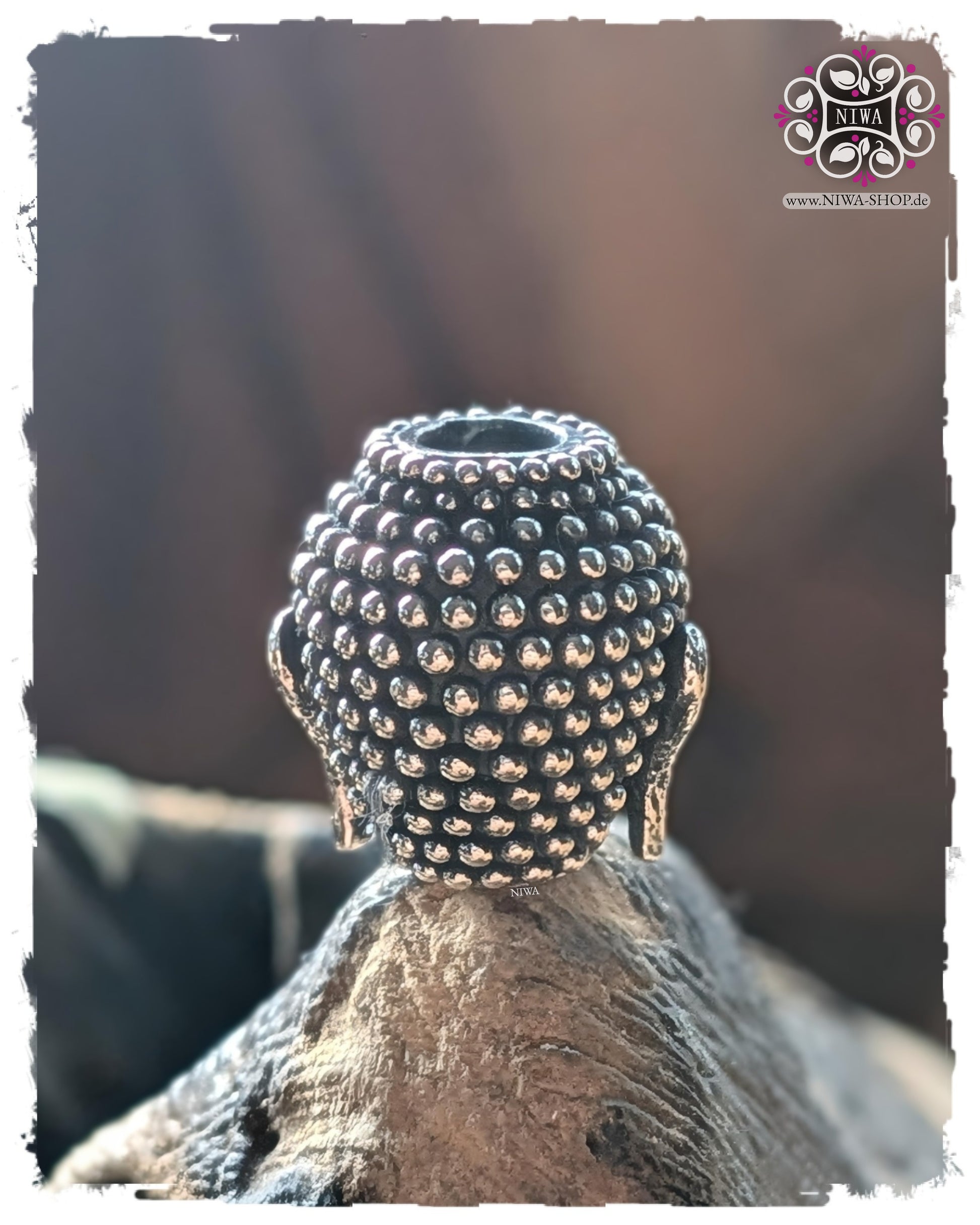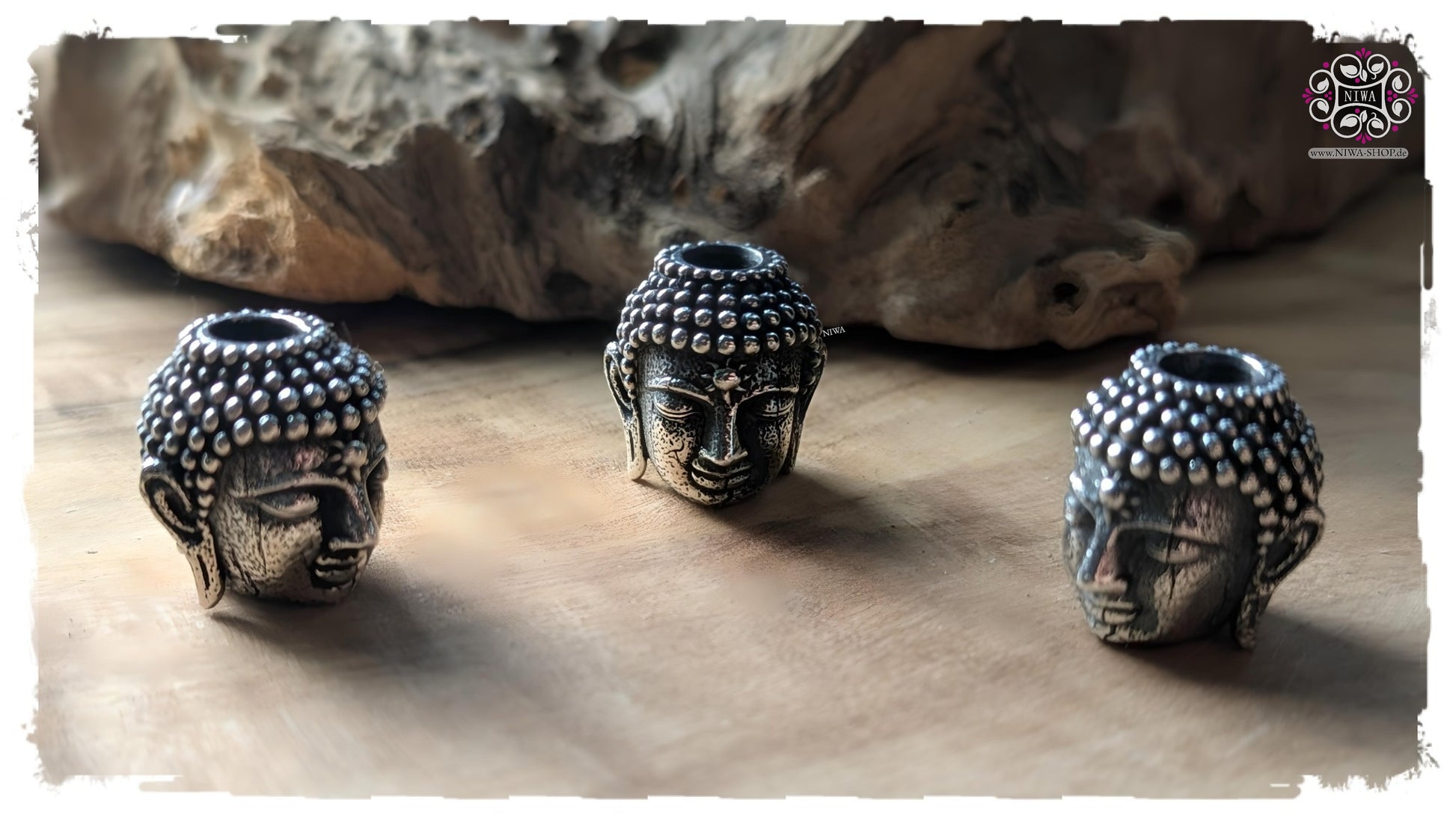 His head is adorned with the classic Ushnisha, an artfully designed structure of spiral-shaped hair coils. It symbolizes not decoration, but spiritual elevation and the perfect wisdom of the Awakened One. The contrast between ancient iconography and the sun symbol on his forehead gives this Buddha a unique spiritual depth.