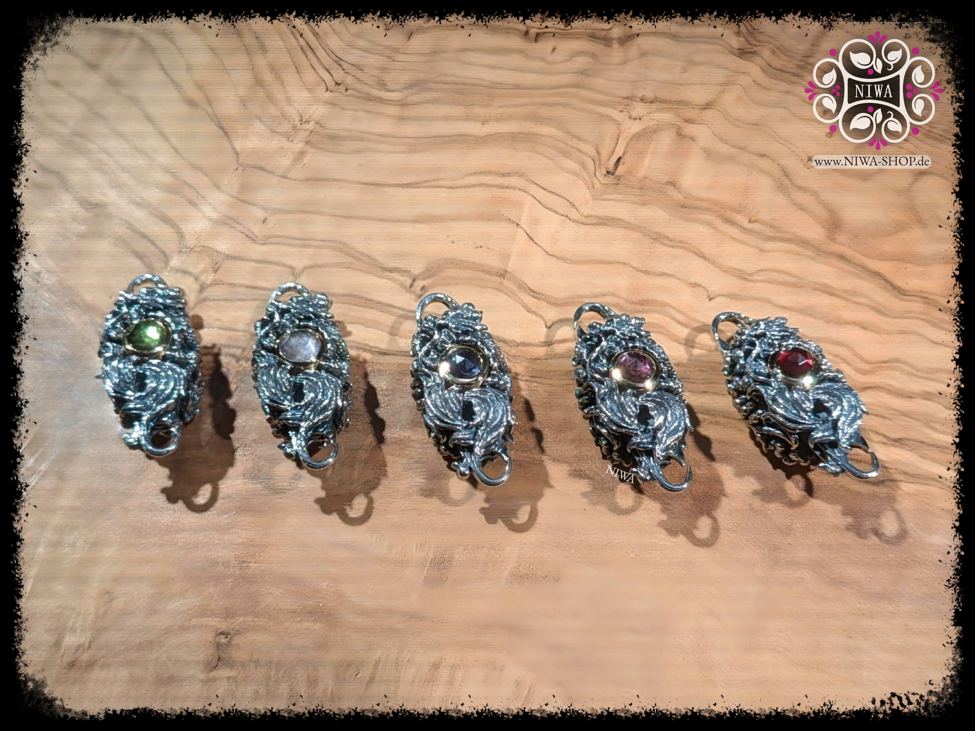 Compared to other closures, the Twin Dragon Lock impresses with its generous size and details that give it a special presence. The closure is made of the finest 925 silver and is occupied by two exquisite gemstones, which are bordered in a massive 18K gold version and look particularly noble due to their Diamond cut cut. 💎✨