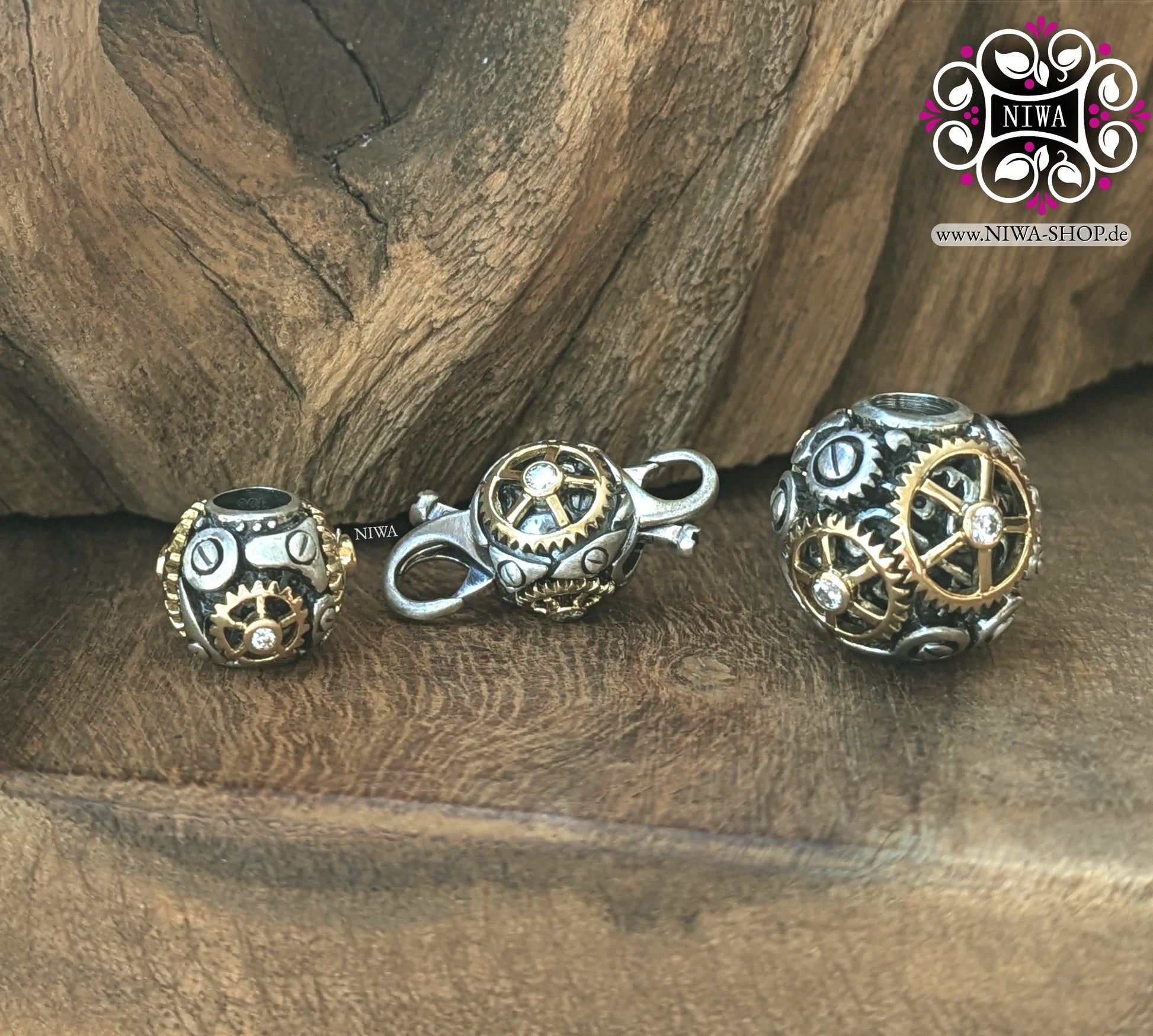 Design and material: The "Wheel of Life" jewelry set presents a harmonious composition of interlocking gears that surround the round bead. The gears are made of noble 18K yellow or rose gold and give the set a luxurious shine. The body's body is made of high -quality 925 sterling silver and has a matt polished surface, which forms an appealing contrast to the golden gears.