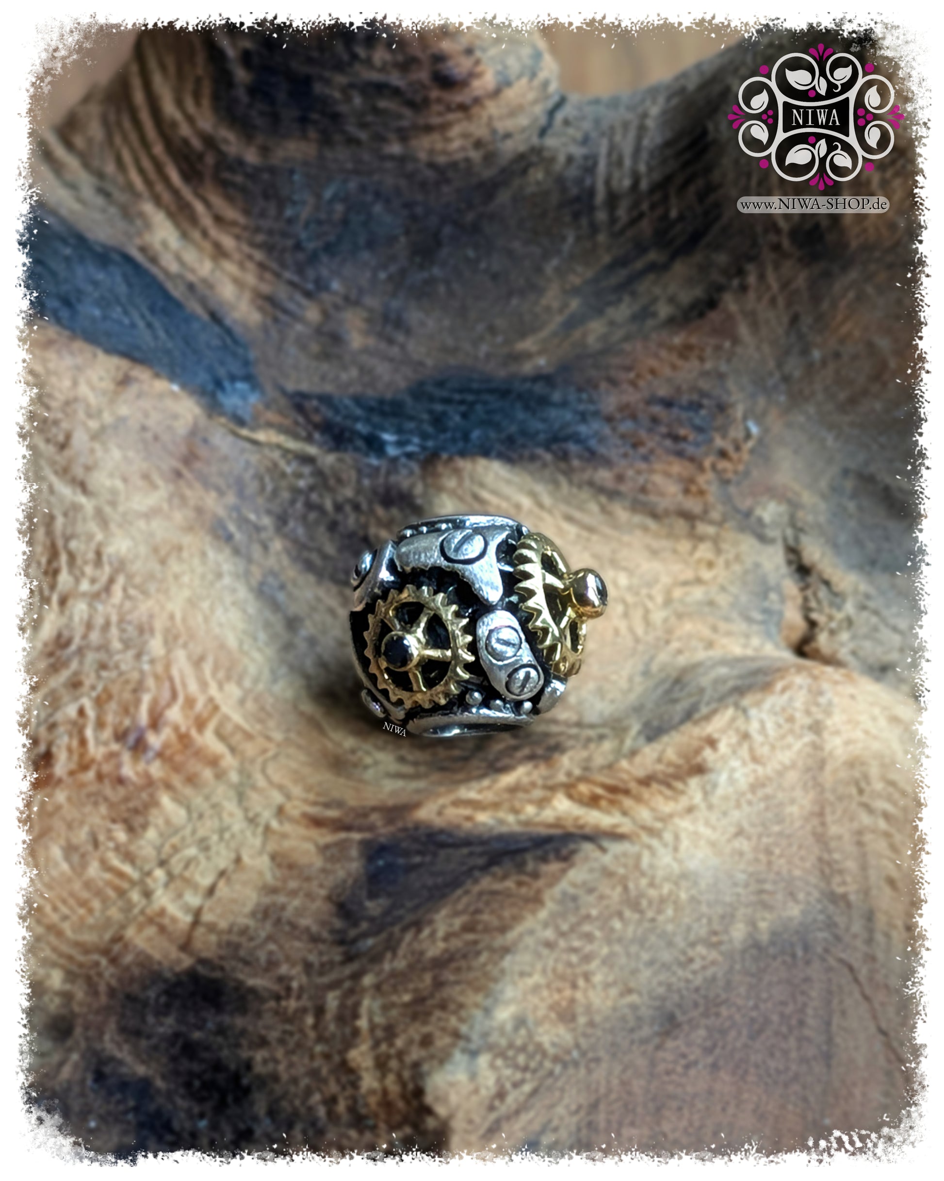 Compact, yet full of detail. The WHEEL of LIFE MiniCharm is the little sister of the large Charm and feels like a miniature time portal on your bracelet. Across its surface, gears, screws and connecting rods move around each other like a finely tuned clockwork. The solid 925 SterlingSilver is gently matt finished so that the polished areas and the gears in 18K YellowGold or RoseGold ⚙️ stand out even more and create an intense contrast.