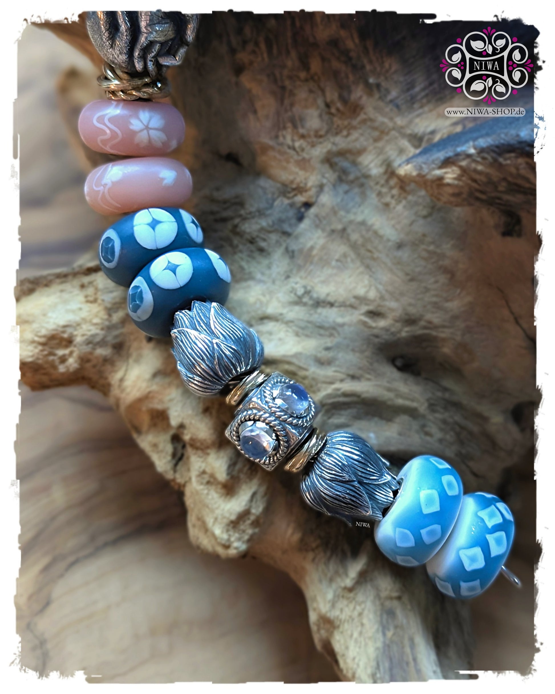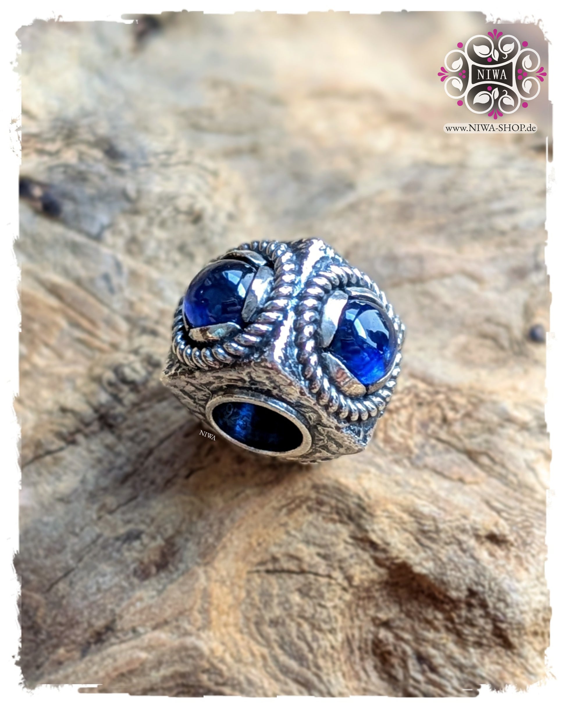 Jede Seite des Charms trägt einen fein geschliffenen Cabochon-Edelstein, der von kunstvoll gedrehten Silbersträngen eingefasst wird. Dieses charakteristische Seilmuster erinnert an antike Ornamente und lässt den Bead massiv und elegant zugleich wirken. ✨