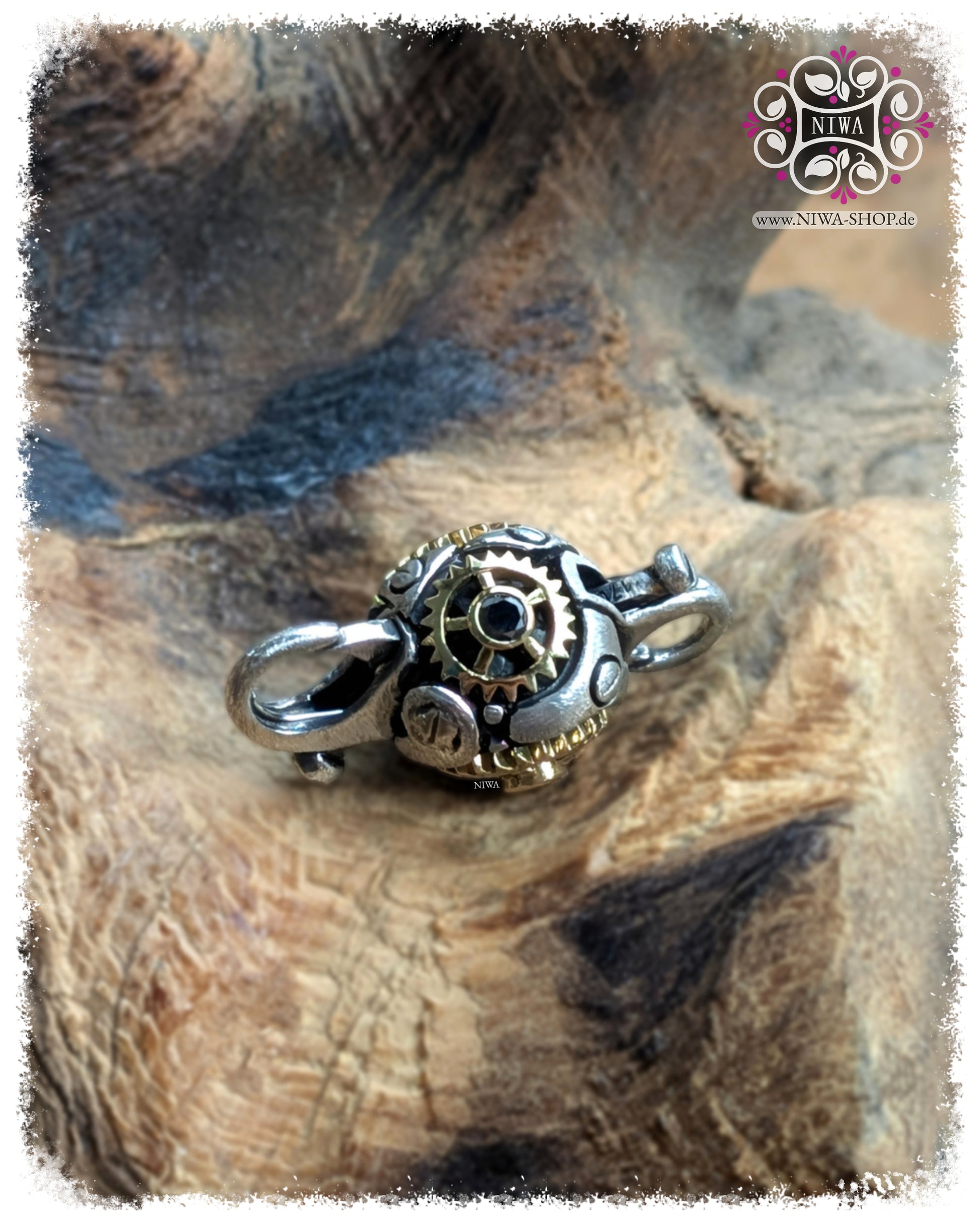 Zwischen den goldenen Zahnrädern verbergen sich winzige technische Miniaturteile, die in reiner Handarbeit modelliert wurden. Mit jeder Bewegung deines Armbands fallen Licht und Schatten in die offenen Bereiche und lassen den Lock wirken, als würde sich das Rad des Lebens in seinem Inneren unaufhörlich weiterdrehen. Gleichzeitig sorgt die solide, ergonomische Konstruktion für einen sicheren Verschluss, der sich angenehm bedienen lässt und dein Armband zuverlässig zusammenhält.